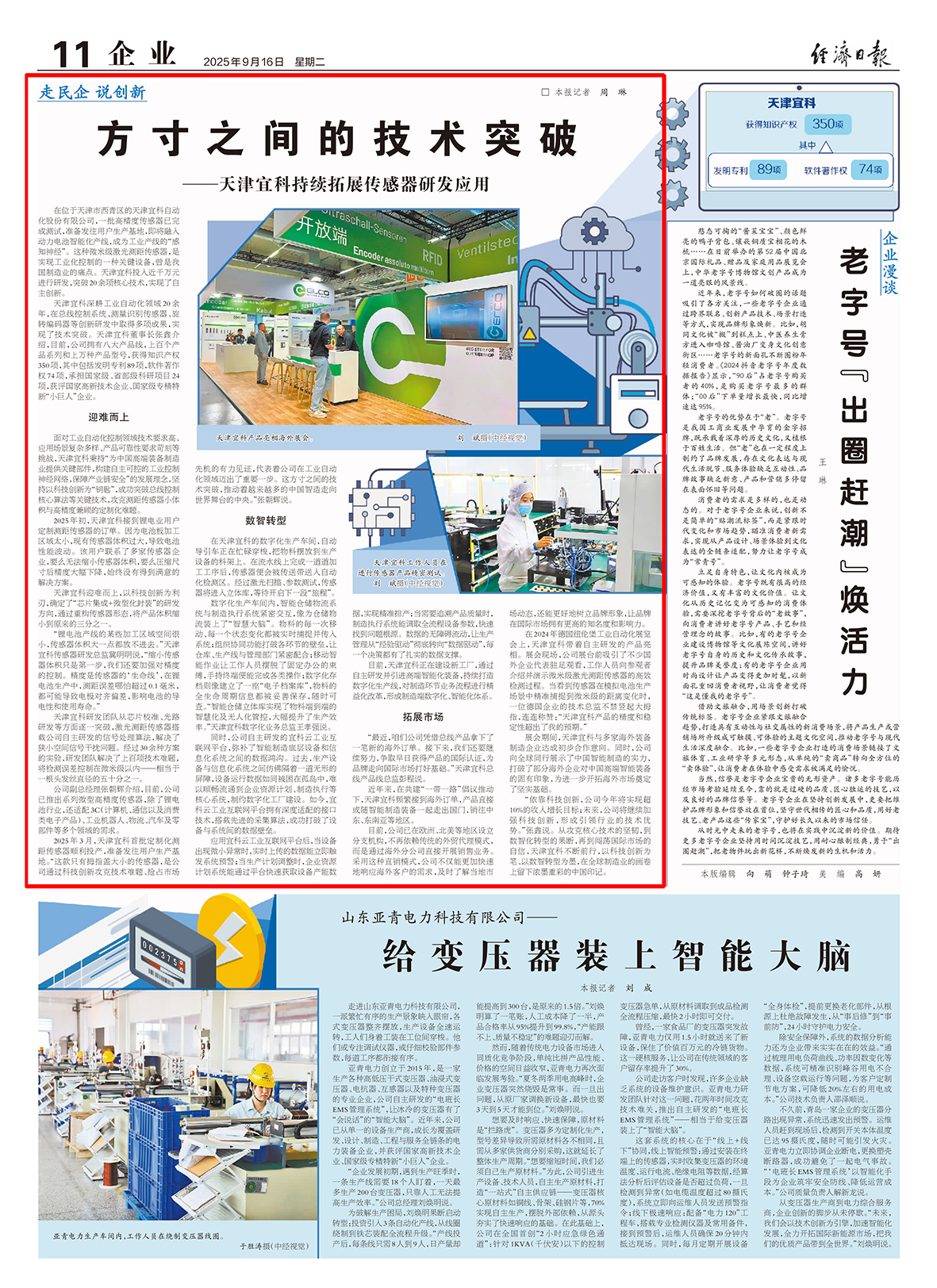 2025年9月16日,《經(jīng)濟(jì)日報》第11版"企業(yè)專欄"以專題報道形式,深度解讀了天津宜科自動化股份有限公司最新科技創(chuàng)新成果。